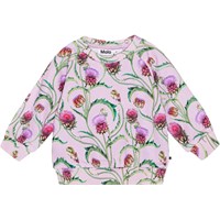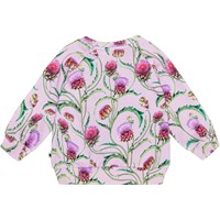 Ljuslila tröja till baby i ekologisk bomullsjersey. Tröjan har ribbkant vid höfter och ärmar ch en rund hals med två tryckknappar i nacken som gör den enkel att ta av och på. Tröjan har ett mönster av fina kronärtskocksblommor i lila, röda och gröna färger. Kombinera tröjan med matchande byxor och få ett komplett set.