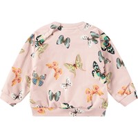 Rosa sweatshirt i ekologisk bomullsjersey för de små med raglanärmar, ribbstickad kant vid midjan och ärmsluten, samt en rund hals med två tryckknappar på baksidan för enkel på- och avklädning. Sweatshirten har ett färgglatt heltryck av fjärilar och en borstad insida, vilket gör den mjuk och varm att ha på.