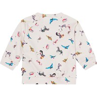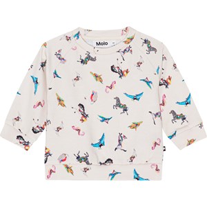 Råvit tröja till baby i ekologisk bomullsjersey. Tröjan har ribbkant vid höfter och ärmar ch en rund hals med två tryckknappar i nacken som gör den enkel att ta av och på. Tröjan har ett mönster av karuselldjur i alla världens färger. Kombinera tröjan med matchande byxor och få ett komplett set.