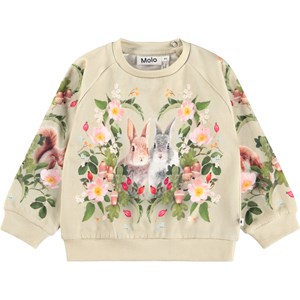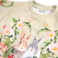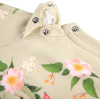 Mjuk sweatshirt för de små i ekologisk bomull. Den är ljusgrön med kaniner och blommor. Sweatshirten har raglanärmar, ribbade kanter och en rund halsringning med knäppning bakom axeln för att göra den enkel att ta av och på.