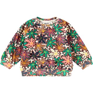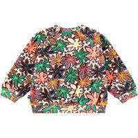 Multifärgad sweatshirt för de små i ekologisk bomullsvelour med en borstad insida, vilket gör den mjuk och varm att ha på. Sweatshirten har raglanärmar, ribbstickade muddar i midjan och ärmsluten, samt en rund hals med två tryckknappar på baksidan, vilket gör den enkel att ta av och på. Det multifärgade trycket består av vackra lönnlöv i olika färger och små svarta blommor.