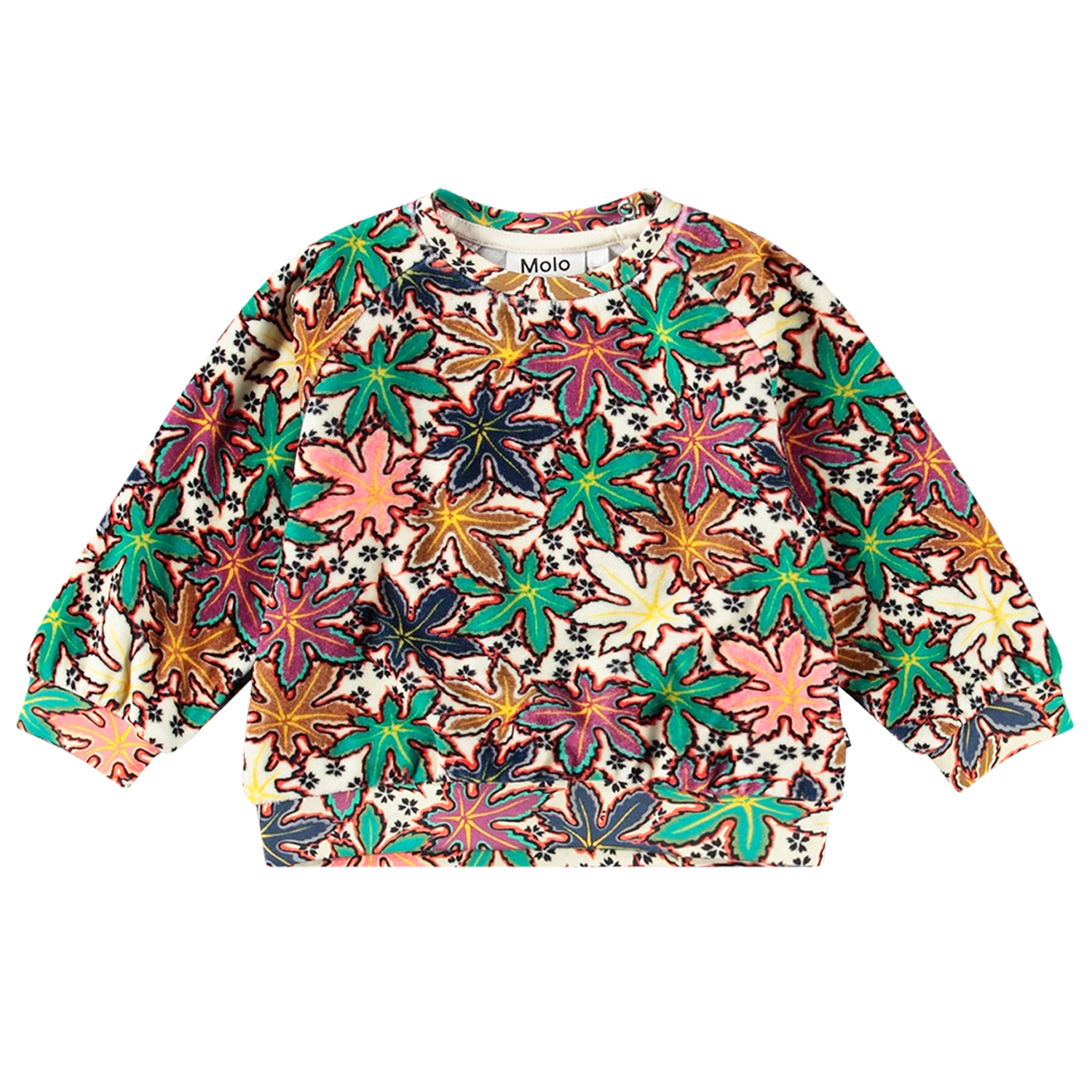 Multifärgad sweatshirt för de små i ekologisk bomullsvelour med en borstad insida, vilket gör den mjuk och varm att ha på. Sweatshirten har raglanärmar, ribbstickade muddar i midjan och ärmsluten, samt en rund hals med två tryckknappar på baksidan, vilket gör den enkel att ta av och på. Det multifärgade trycket består av vackra lönnlöv i olika färger och små svarta blommor.
