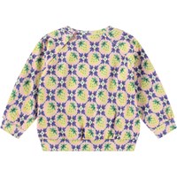 Mjuk sweatshirt för de små i ekologisk bomull. Sweatshirten har raglanärmar, ribbade kanter och en rund halsringning med knäppning bakom axeln, vilket gör den enkel att ta på och av. Denna sweatshirt är rosa med lila blommor och gula jordgubbar. Matcha med matchande byxor för en komplett outfit.