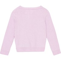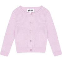 Stickad ljuslila kofta till baby i ekologisk bomull. Koftan har fin ribbsttickning i ärmat, hals och vid höften. Framtill stängs koftan med små pärlemorsknappar.