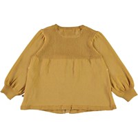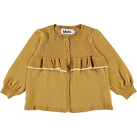 Gerda är en honungsfärgad babykofta i stickad bomull. Koftan har en volangkant framtill. Kombinera koftan med matchande volangbyxor.
