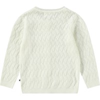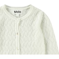 Vit stickad kofta för de små. Koftan har ett delikat mönster och ribbade kanter på ärmarna, halsringningen och nederkanten. Den knäpps framtill med små pärlknappar.