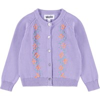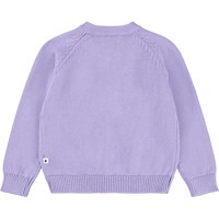 Lila stickad kofta för de små. Koftan har ett lövmönster och ribbade kanter runt ärmarna, halsen och midjan. Den har små knappar av pärlemor framtill.