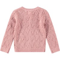 Rosa stickad kofta för de små med ett fint mönstrat stickat tyg och ribbstickade muddar på ärmarna, i halsen och i midjan. Stängs med små knappar av pärlemor på framsidan.