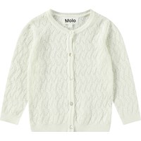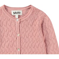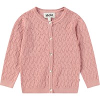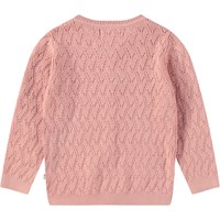 Rosa stickad kofta för de små. Koftan har ett delikat mönster och ribbade kanter på ärmarna, halsringningen och nederkanten. Den knäpps framtill med små pärlknappar.