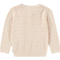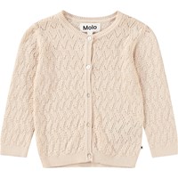 Off-white stickad kofta i ekologisk bomull för de små. Koftan har ett fint stickmönster och ribbade kanter på ärmarna, i halsen och i midjan. Stängs med små knappar av pärlemor på framsidan.