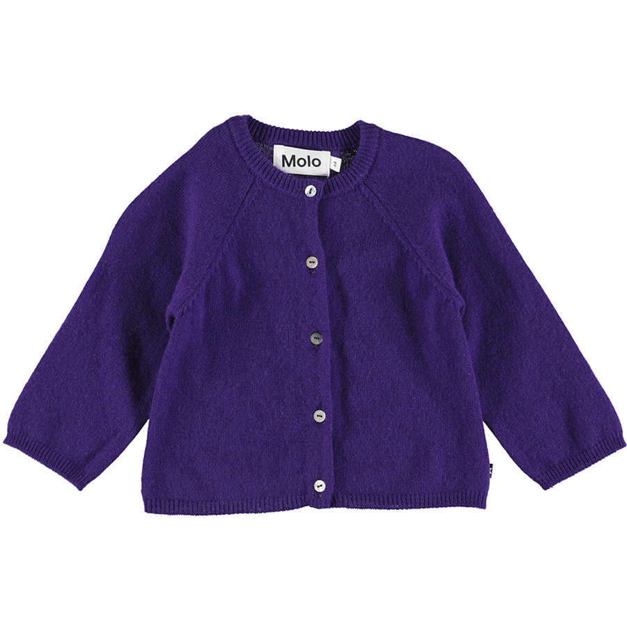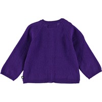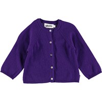 Lila baby cardigan i en blandning av ull och cashmere. Cardiganen har raglanärmar, pärlemorsfärgade knappar framtill samt ribb i hals, ärmslut och nederkant.