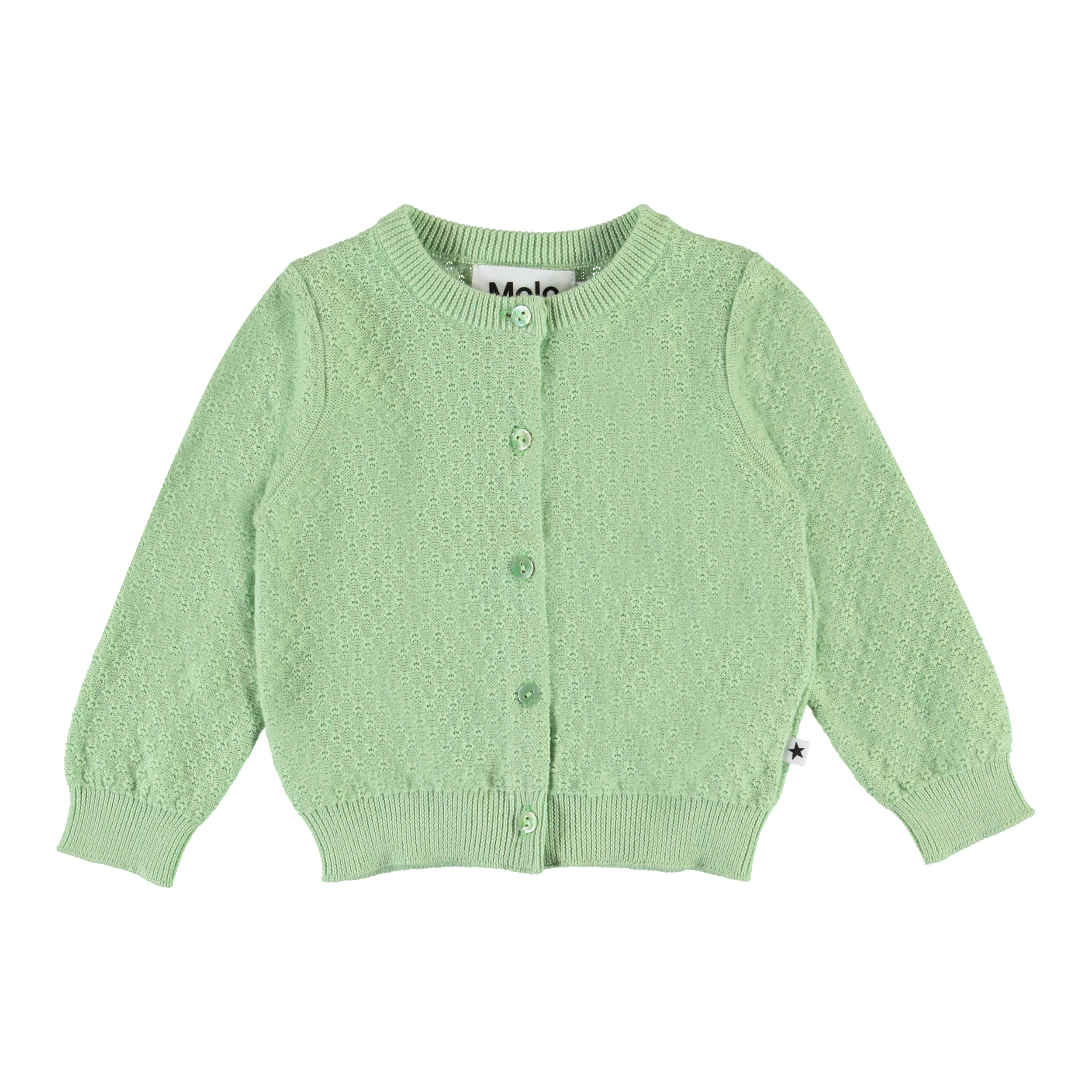Ginny är en långärmad, stickad ljusgrön baby cardigan med fint hålmönster. Ginny har pärlemorsfärgade knappar framtill, samt ribb vid hals, ärmslut och nederkant.