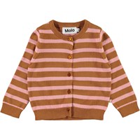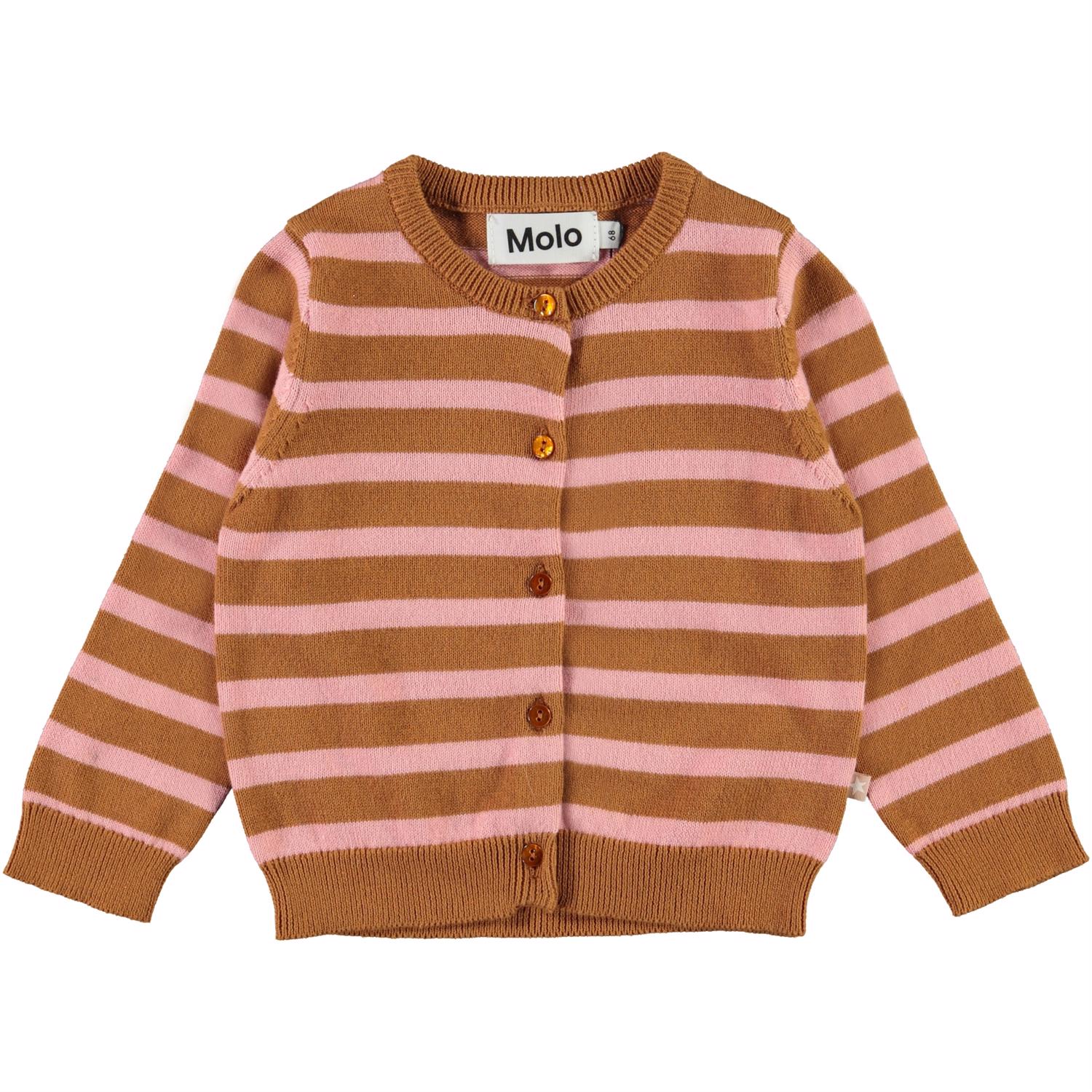 Ginny är en långärmad, stickad kofta med bruna och rosa ränder. Ginny har knappar framtill samt en ribbad krage, ärmslut och botten.