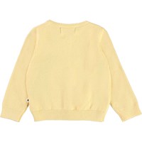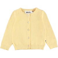 Ginny är en långärmad stickad ljusgul kofta med fint hålmönster. Ginny har matchande pärlemorsfärgade knappar framtill och ribbad kant vid hals, ärmslut och nertill.