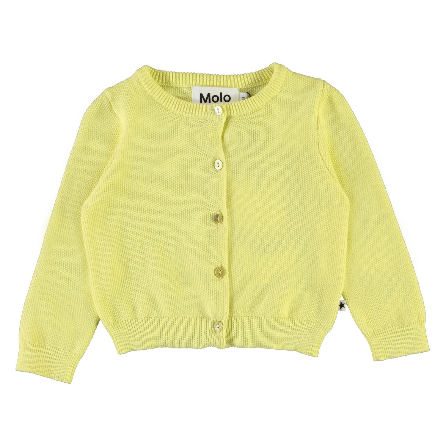 Ginny är en långärmad, stickad gul baby kofta. Ginny har pärlemorsknappar längst fram, samt revben i nacken, ärmändarna och botten.