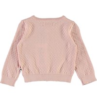 Ginny är en långärmad, stickad rosa baby kofta. Ginny har pärlemorsknappar längst fram, samt revben i nacken, ärmändarna och botten.