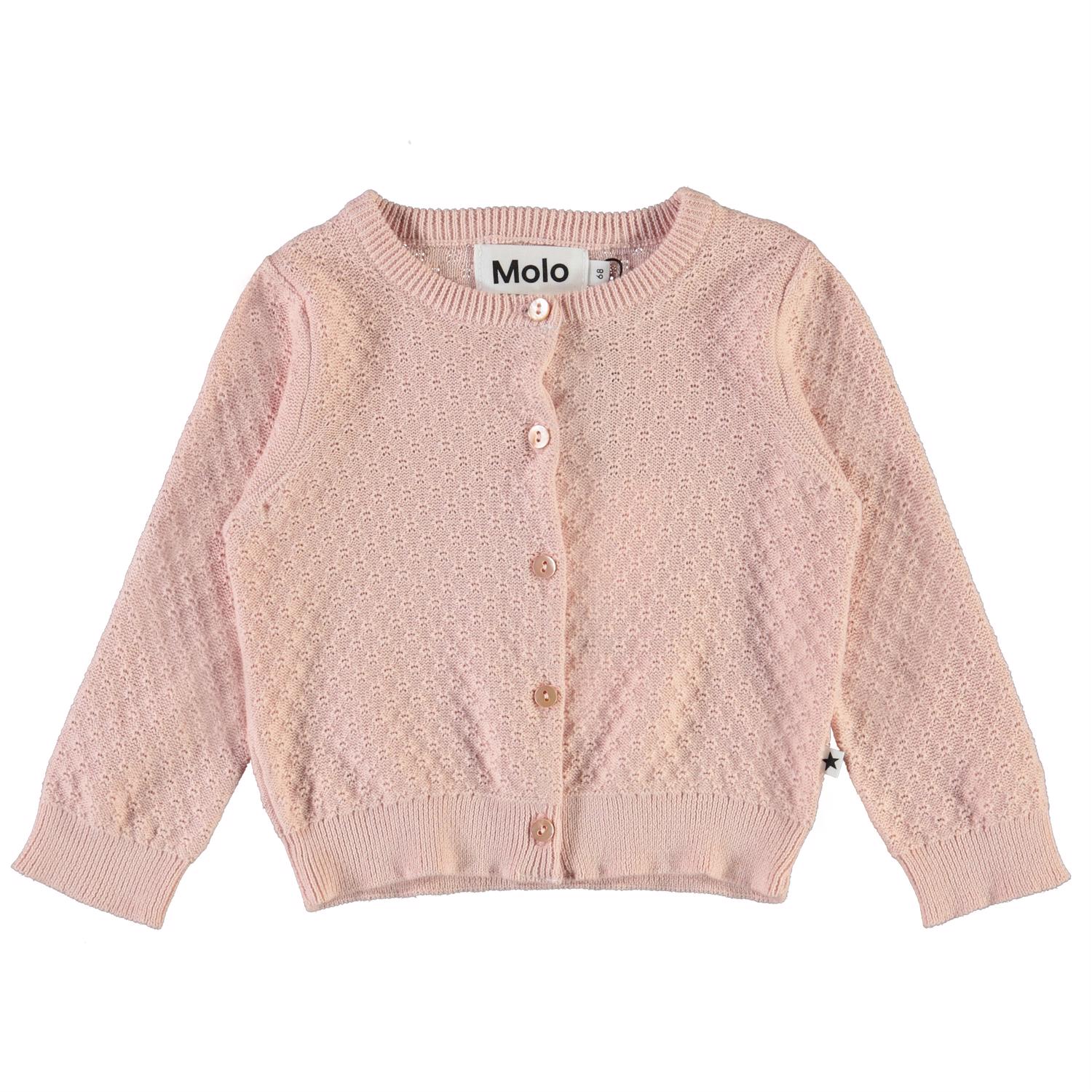 Ginny är en långärmad, stickad rosa baby kofta. Ginny har pärlemorsknappar längst fram, samt revben i nacken, ärmändarna och botten.
