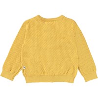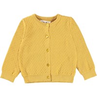 Ginny är en långärmad, stickad, gul babykofta. Ginnyhar knappar framtill och ribbkant vid hals, ärmslut och nertill.