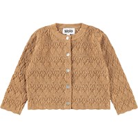 Brun stickad kofta för de små i en blandning av ull och bomull. Denna kofta har ett vävt mönster och pärlknappar hela vägen ner.