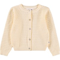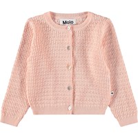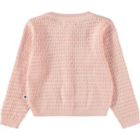 Rosa stickad kofta för de små i mjuk, ekologisk bomull. Den har ribbade kanter och knäpps med små pärlemorknappar framtill.