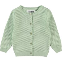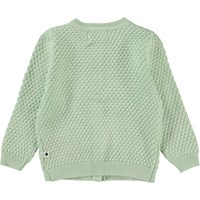 Goldie är en mintgrön stickad babykofta i 100% ekologisk bomull. Goldie är stickad i ett fint cirkelmönster, har rund hals och gröna knappar framtill.