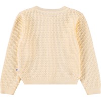 Gräddfärgad stickad kofta för de små i mjuk, ekologisk bomull. Den har ribbade kanter och knäpps med små pärlemorknappar framtill.