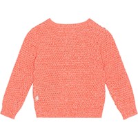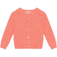 Röd- och vitmelerad stickad kofta till baby i mjuk bomull. Koftan har ribbkant vid hals, ärmar och höfter och knappar med fina pärlemorsknappar. Koftan är stickad i ett fint mönster och har en normal passform.