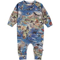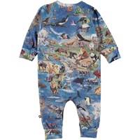 Faifax är en blå babybody i 100% ekologsk bomullsjersey. Bodyn har långa ärmar och ben och är här med jordens kontinenter och alla de djur som lever, både på land och i vatten. Faifax har knappar på ena axeln och mellan benen.