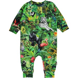 Fairfax är en babydräkt med långa ärmar och ben och med ett tryck av djur i en djungel. Dräkten har raglanärmar och tryckknappar i nacken och mellan benen.