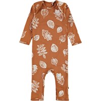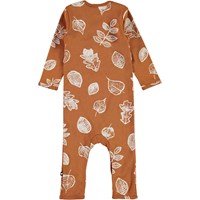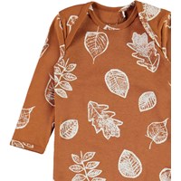 Faso är en brun babydräkt med långa ben och ärmar och vita blad. Tryckknappar mellan benen gör bodyn enkel att ta på och av.