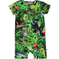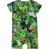 Felton är en babybody med ett djungeltryck med djur. Bodyn har korta ärmar och ben. Tryckknappar i nacken och mellan benen gör den enkel att ta av och på.
