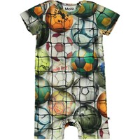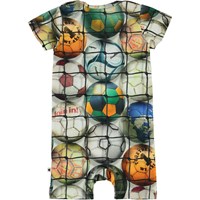 Felton är en babybody med ett tryck av fotbollar. Bodyn har korta ärmar och ben. Tryckknappar i nacken och mellan benen gör den enkel att ta av och på.