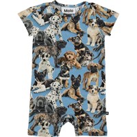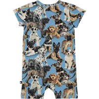 Felton är en ljusblå dräkt med söta hundvalpar och korta ärmar och ben. Tryckknappar vid halsen och mellan benen gör den enkel att ta av och på.