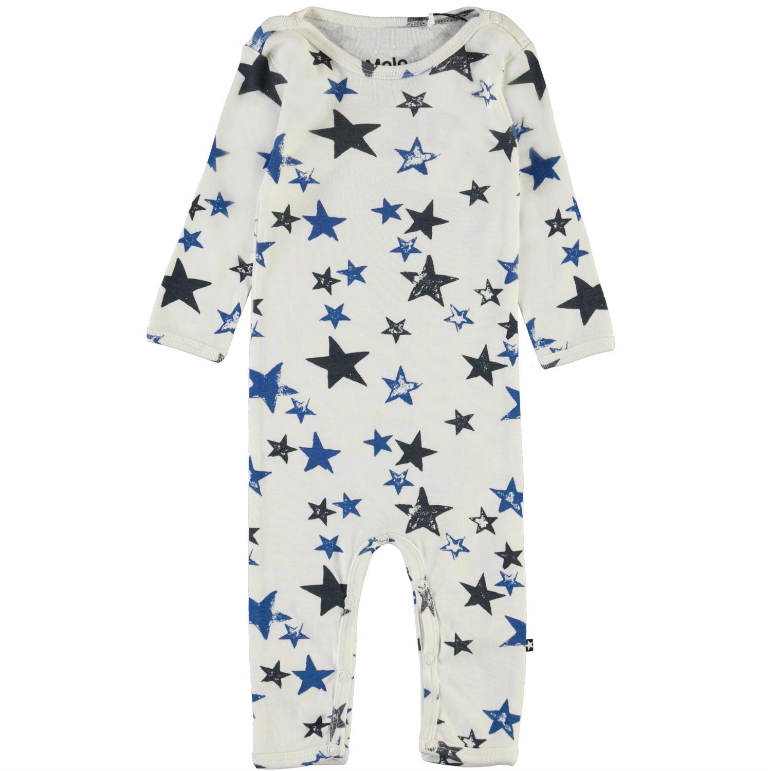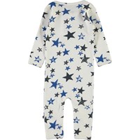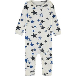 Fenez är en vit babybody med långa ben och ärmar med blå och svarta stjärnor. Tryckknappar i nacken och benen gör den enkel att ta på och av.