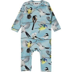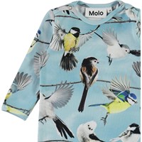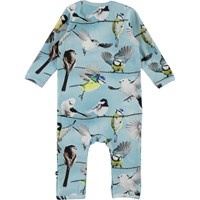 Fenez är en ljusblå body med långa ben och ärmar. Fenez har ett tryck med fåglar på. Tryckknappar i nacken och benen gör bodyn enkel att ta på och av.