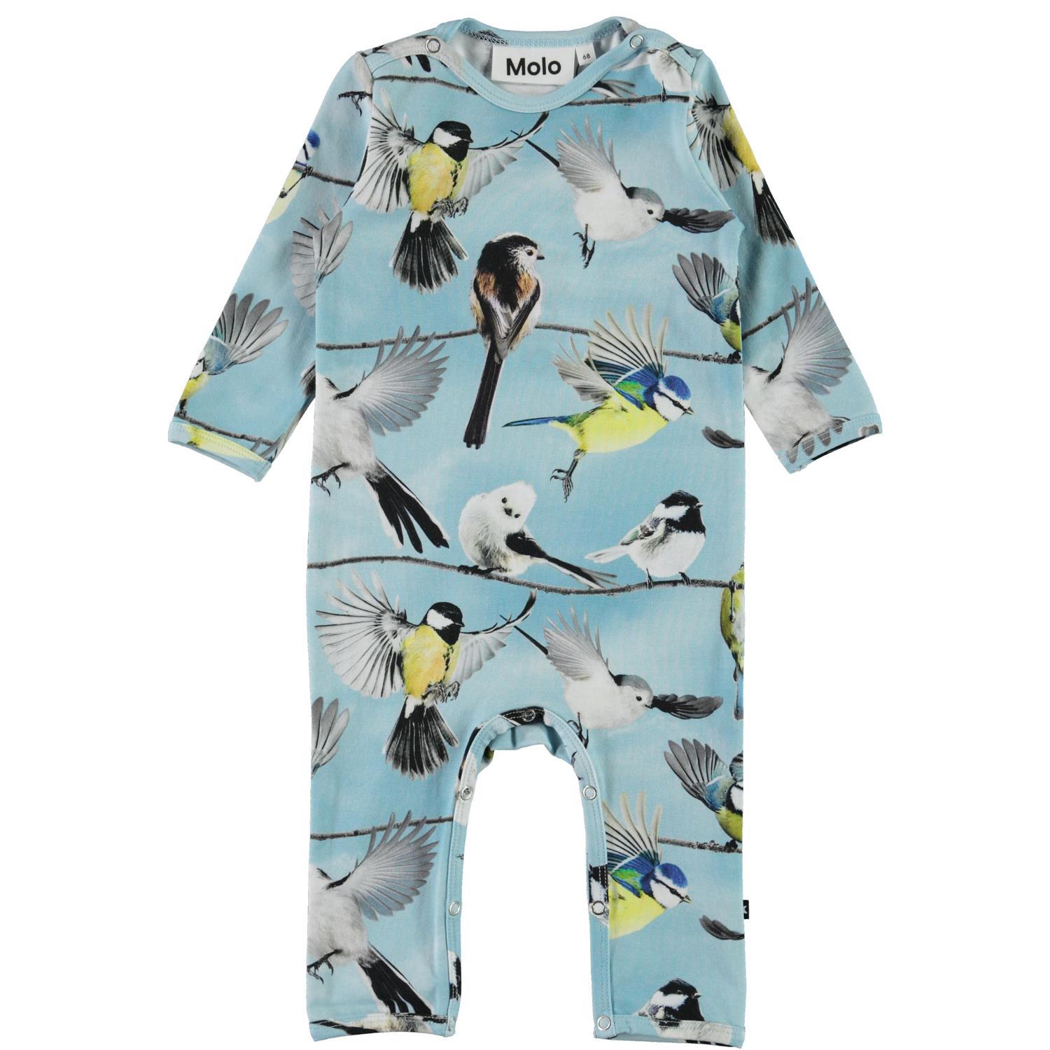 Fenez är en ljusblå body med långa ben och ärmar. Fenez har ett tryck med fåglar på. Tryckknappar i nacken och benen gör bodyn enkel att ta på och av.