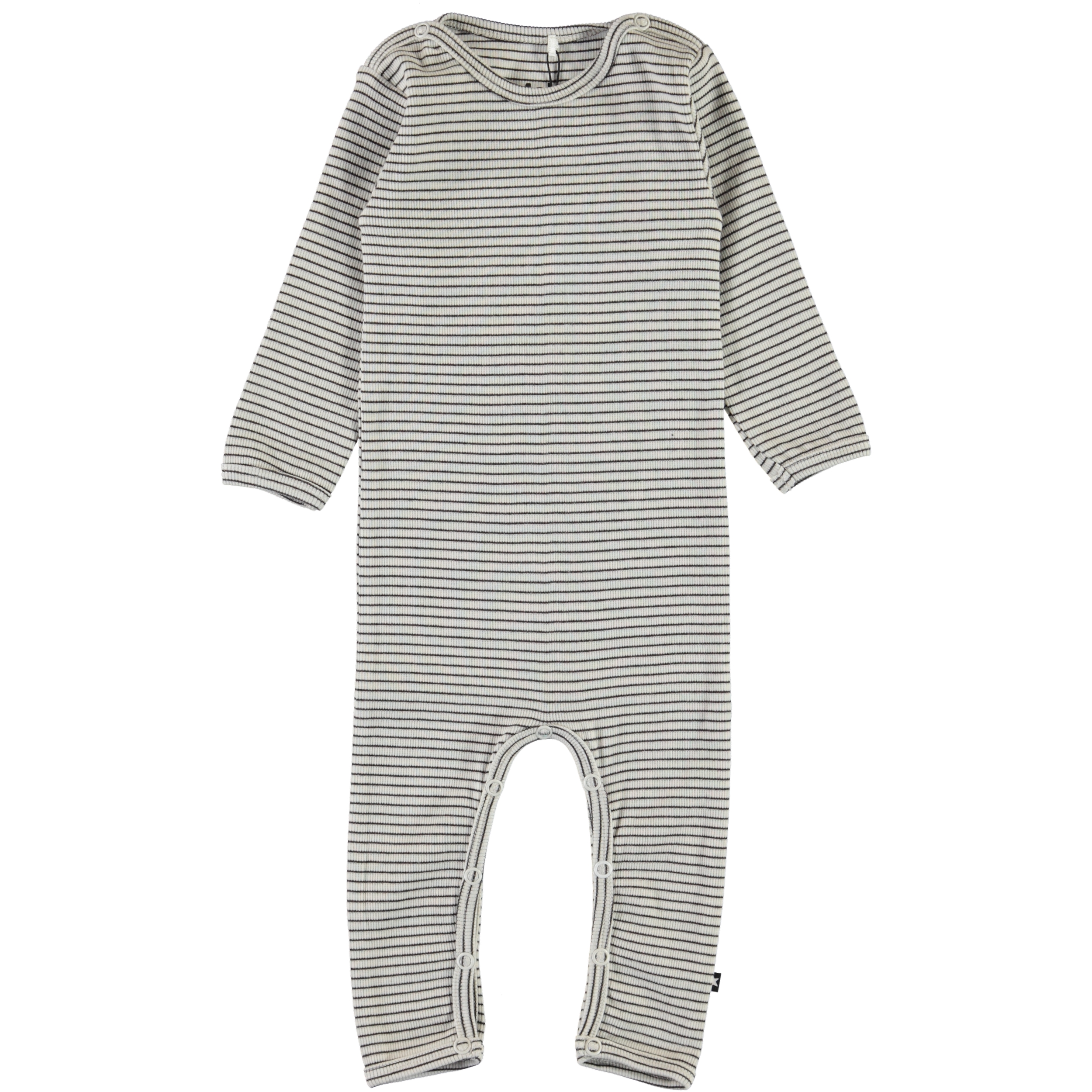 Fenez är en vit- och brunrandig baby body. Tryckknappar vid halsen och i grenen, gör bodyen lätt att ta av och på.