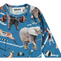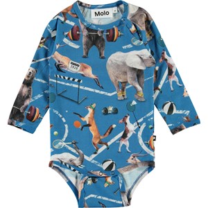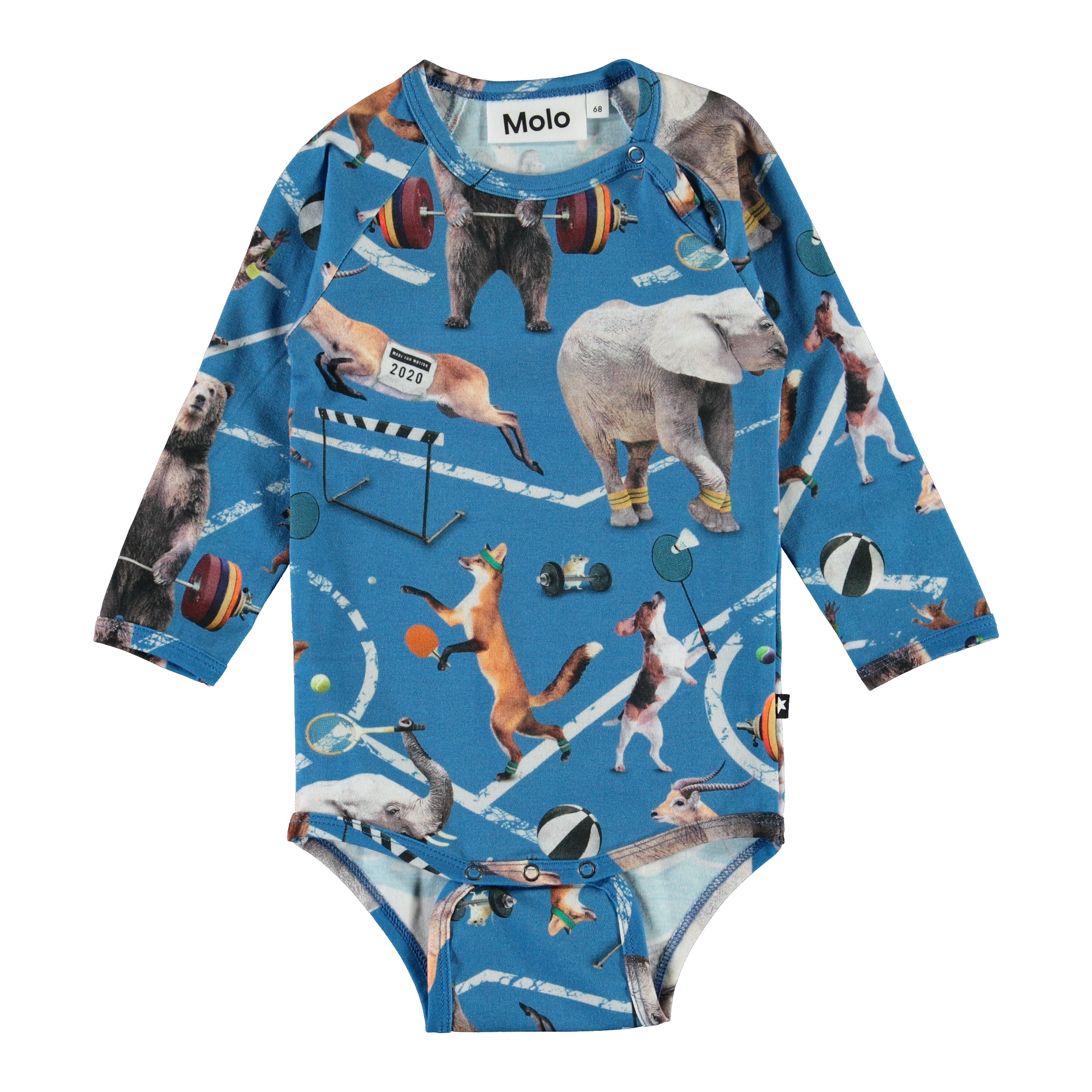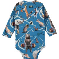 Field är en ljusblå långärmad body med olika djur som sportar. Tryckknappar vid halsen och i grenen, gör bodyen lätt att ta av och på.