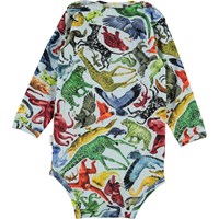 Field är en ljusblå långärmad babybody med ett tryck av färgglada djur. Tryckknappar i nacken och mellan benen gör den enkel att ta av och på.