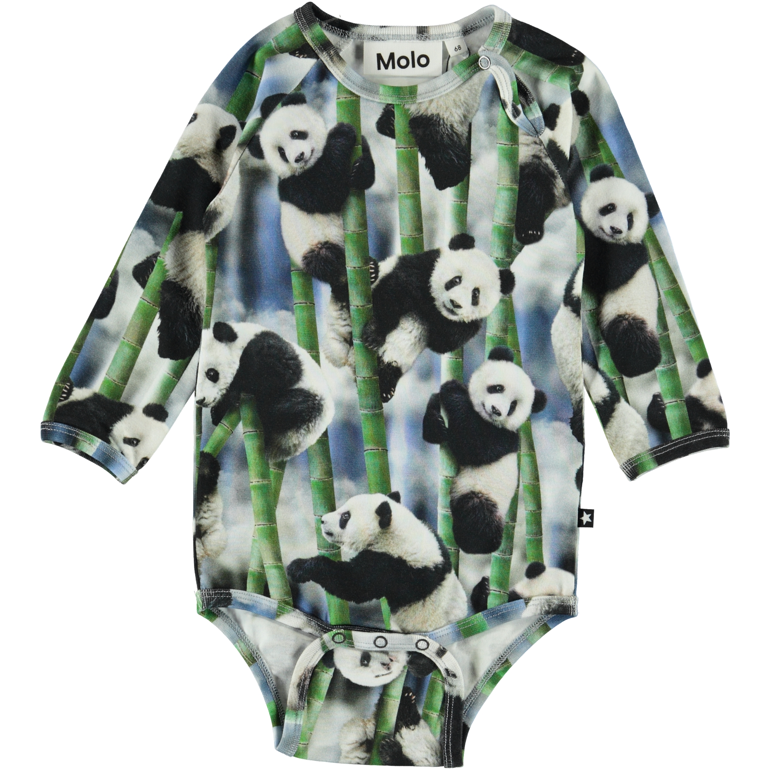 Field är en långärmad baby body med all-over tryck av pandabjörnar och deras favoritmat bambus. Tryckknappar vid halsen och i grenen, gör bodyen lätt att ta av och på.