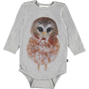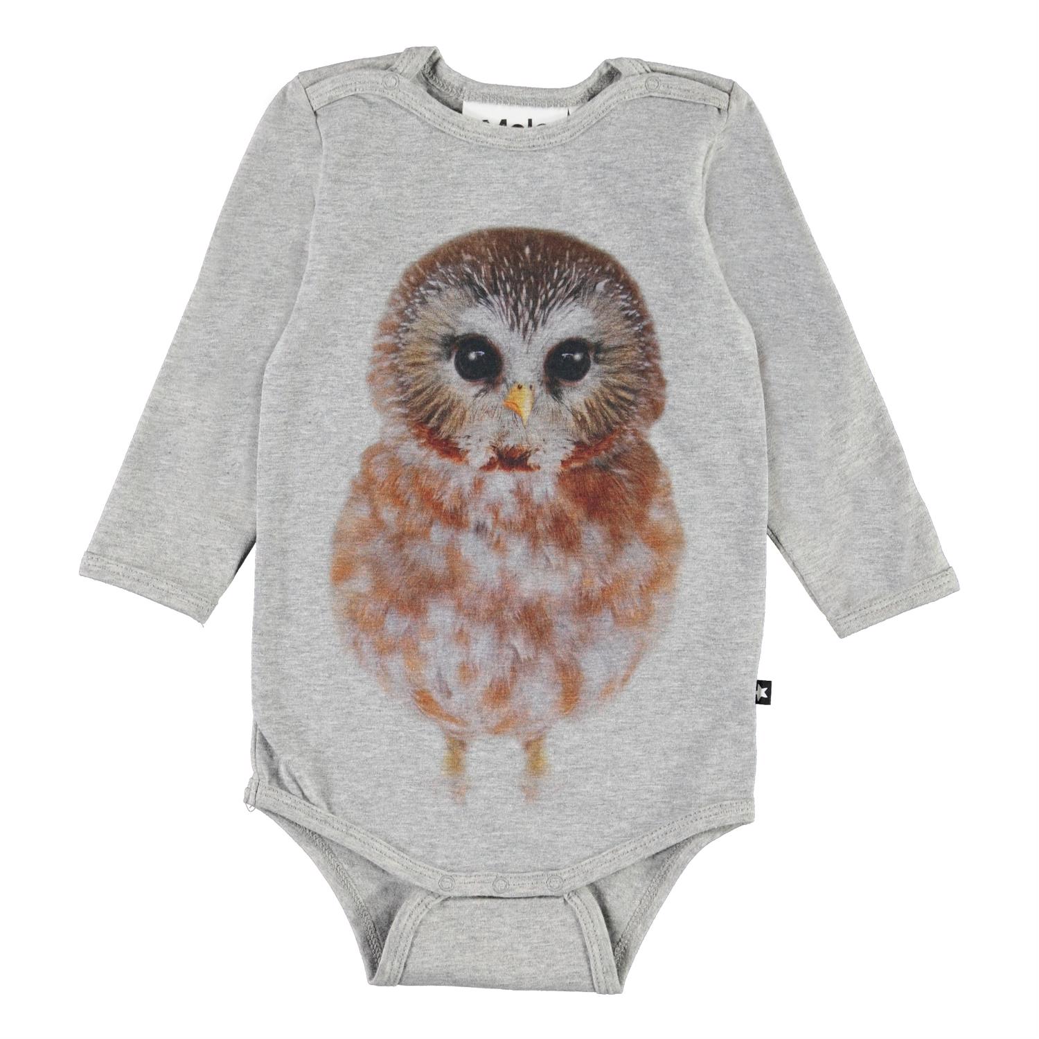 Foss är en långärmad grå body med en ugla framtill. Tryckknappar i nacken och mellan benen gör den enkelt att ta av och på.