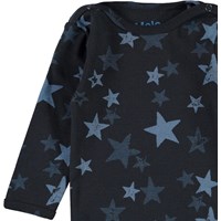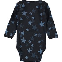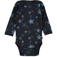 Foss är en långärmad mörkblå body med stjärntryck. Tryckknappar i nacken och mellan benen gör den enkelt att ta av och på.