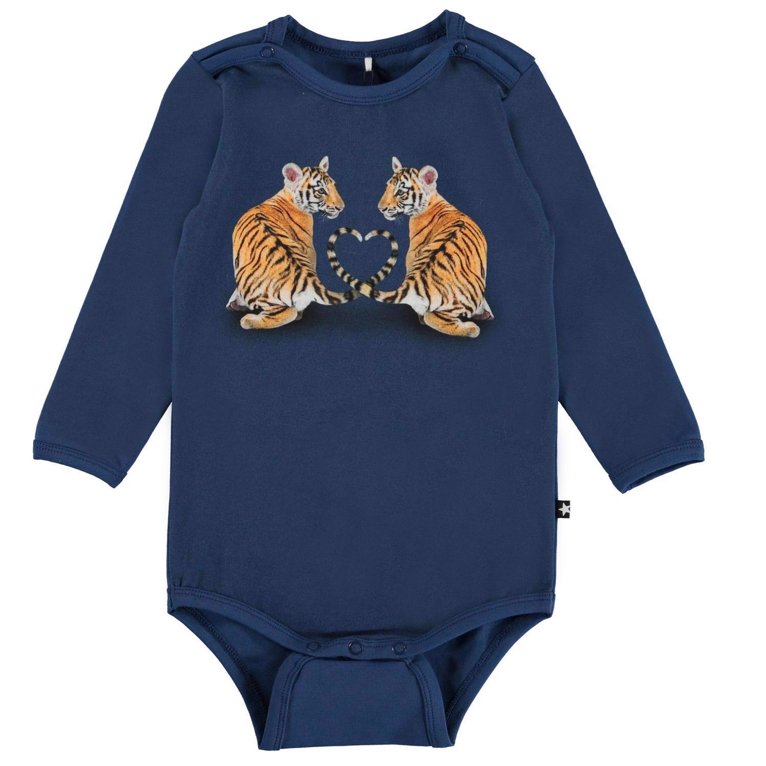 Foss är en blå babybody med tigerungar vars svansar formar ett hjärta. Foss har tryckknapp vid halsen och mellan benen för att enkelt få den av och på.