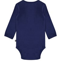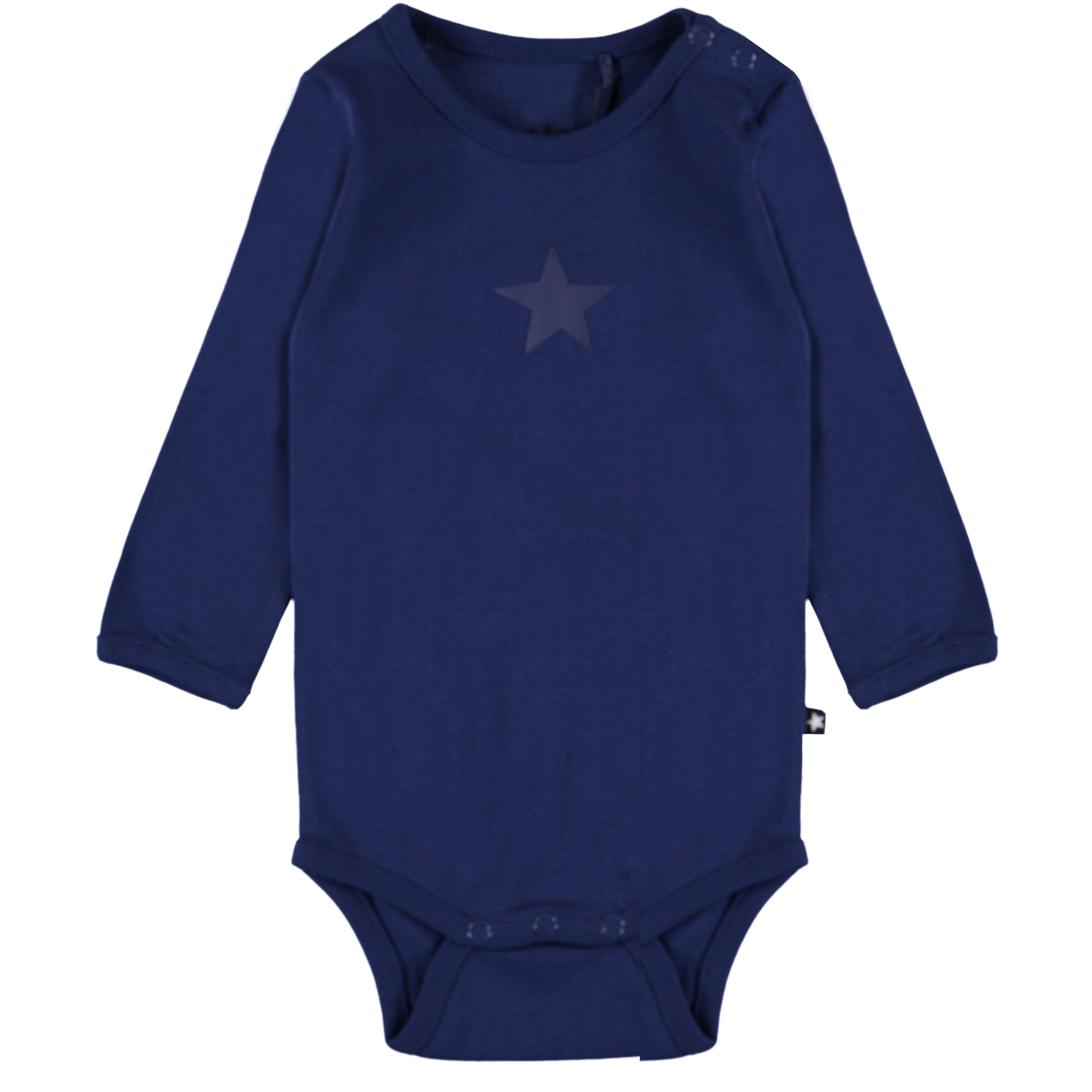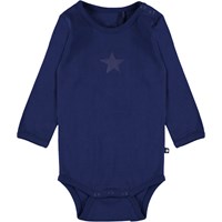 Foss är en långärmad, mörkblå body med tryckt stjärna framtill. Tryckknappar vid halsen och i grenen, gör bodyen lätt att ta av och på.