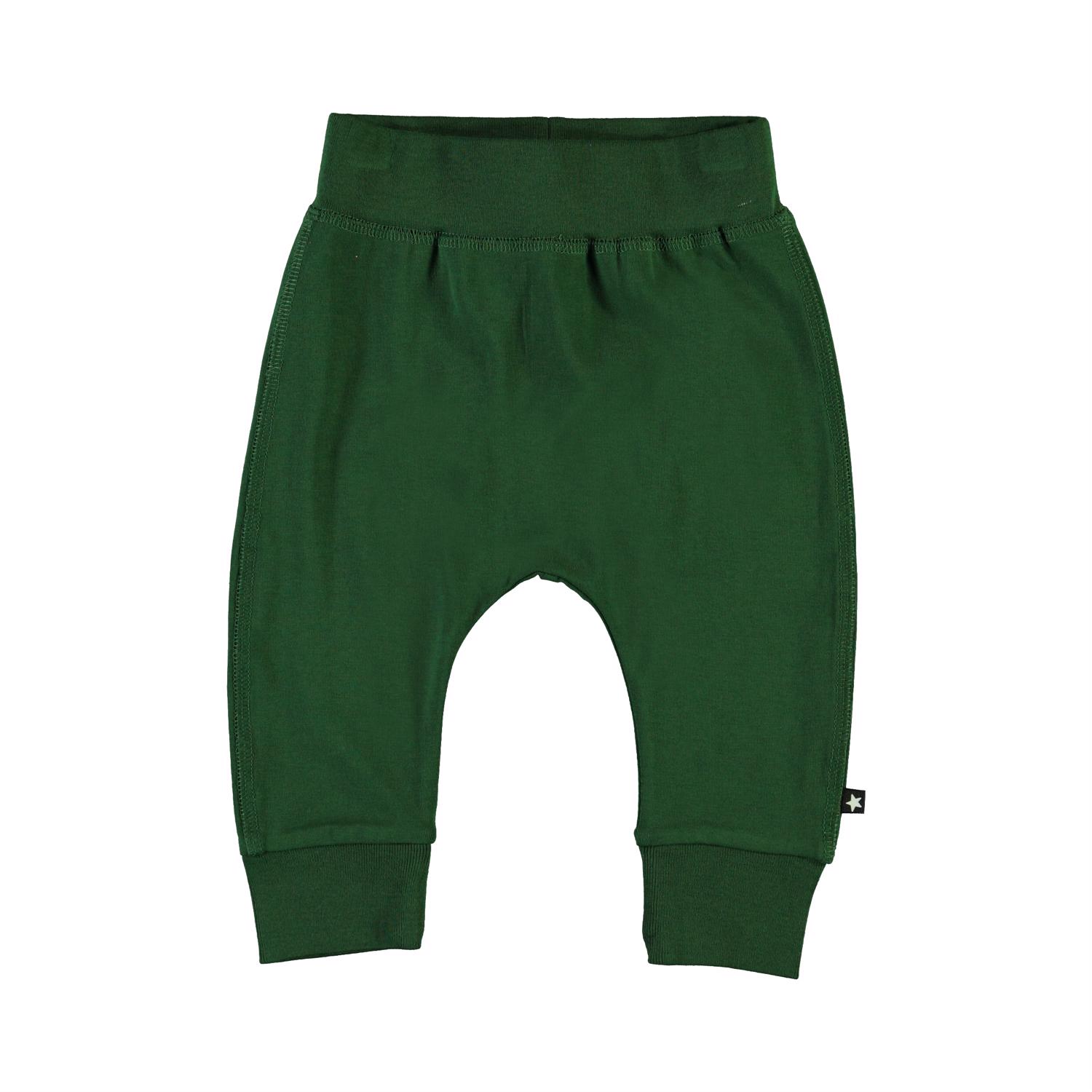 Sammy är ett par rymliga, gröna babybyxor med en bred, elastisk ribbkant i midjan och i benslut.