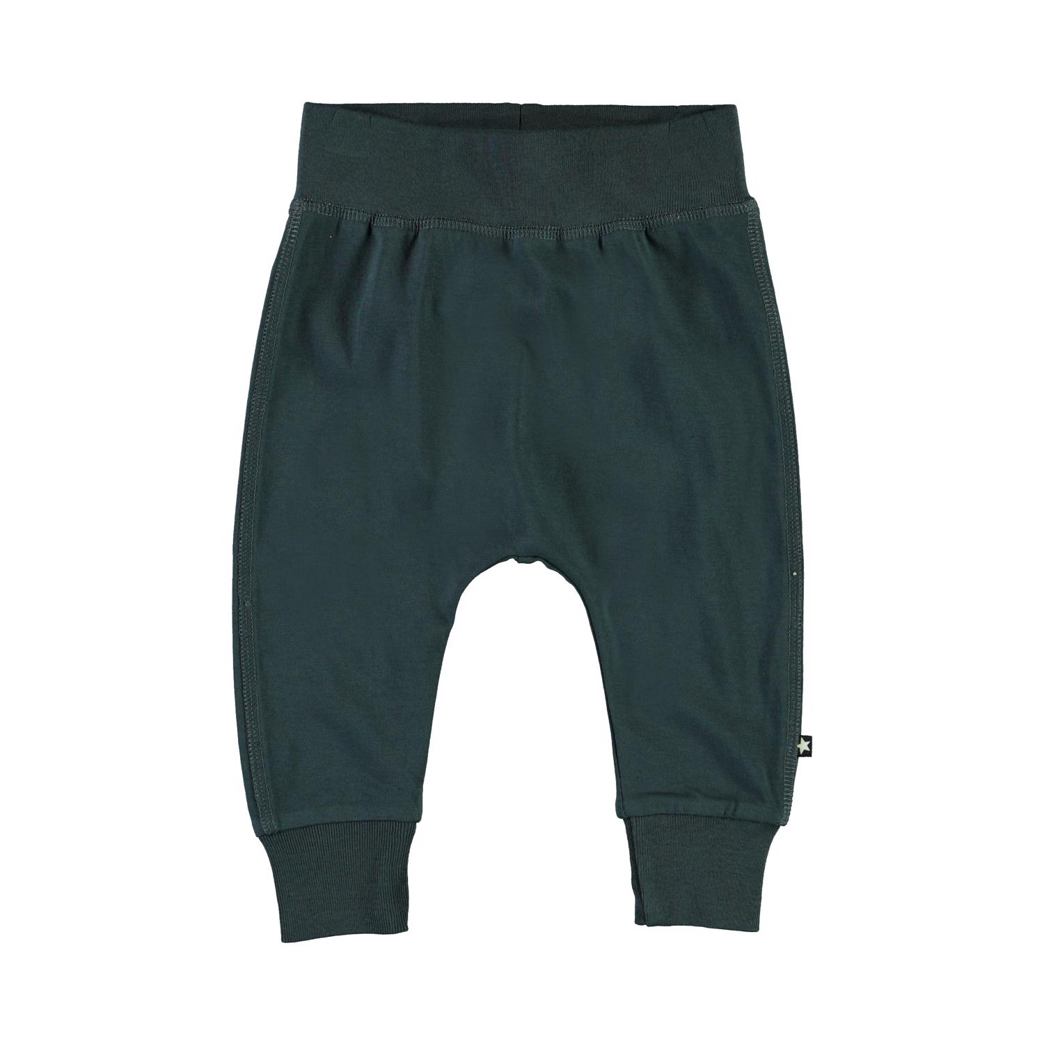 Sammy är ett par rymliga, mörkblå babybyxor med en bred, elastisk ribbkant i midjan och i benslut.