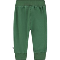 Gröna byxor för de små i ekologisk bomullsjersey. Byxorna har en bred elastisk resår i midjan och bensluten samt synliga sömmar framtill. De är mjuka att bära och ger gott om utrymme att röra sig.