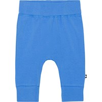 Mörkblå babybyxor i ekologisk bomulsjersey. Byxorna har en bred midja, breda benslut och synliga sömmar framtill som ger dem en sweatpants look. De är mjuka att ha på med massor av plats för rörelse.