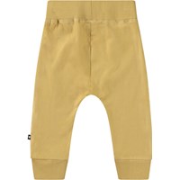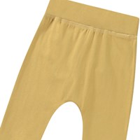 Ljusbruna byxor i ekologisk bomullsjersey för de små. Byxorna har en bred elastisk resår i midjan och muddar, samt synliga sömmar framtill, vilket ger dem en byxliknande look. De är mjuka att bära och ger gott om utrymme för rörelse.