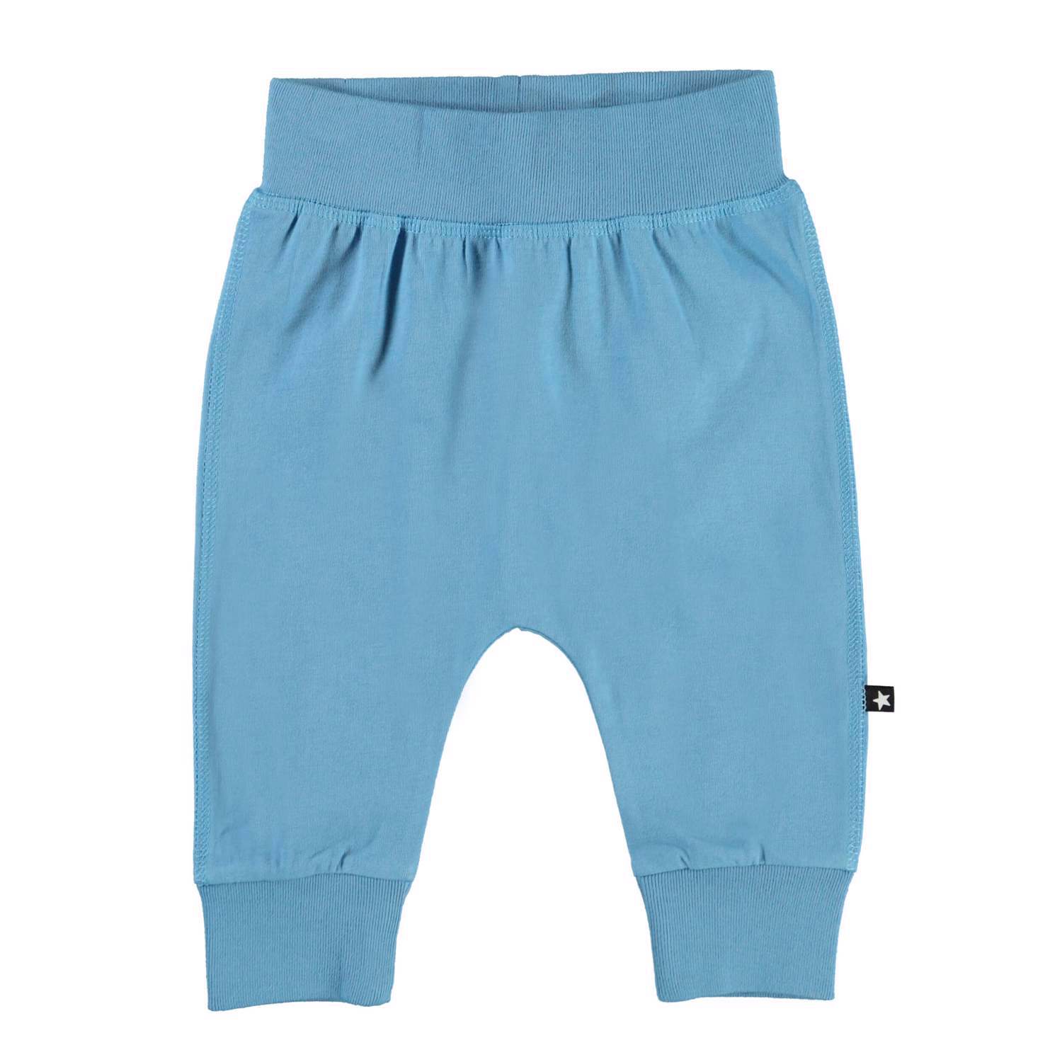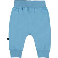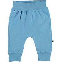 Sammy är ett par mjuka blå babybyxor med brett gummiband i midjan och vid benslut. Byxorna har synliga sömmar framtill vilket ger en sweatpantslook.